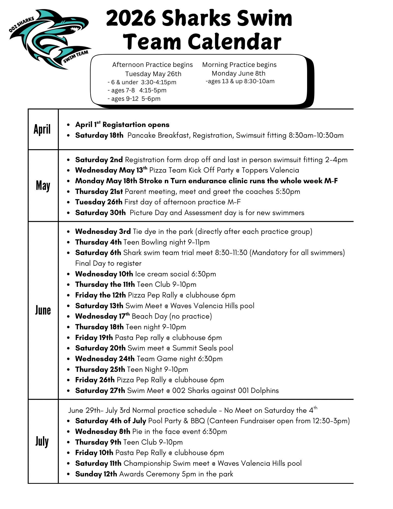 It’s with great excitement that we welcome back the 2026 Shark’s Swim Team Season.